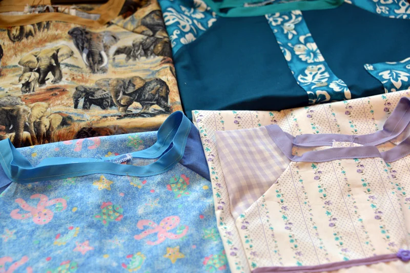 She provides all the supplies and materials herself. With the gowns, she also includes a protector or a bib for the patients. She adds flair and personality to each gown by adding decorative pins, lace or other fun additions like ties for the mens’ gowns.